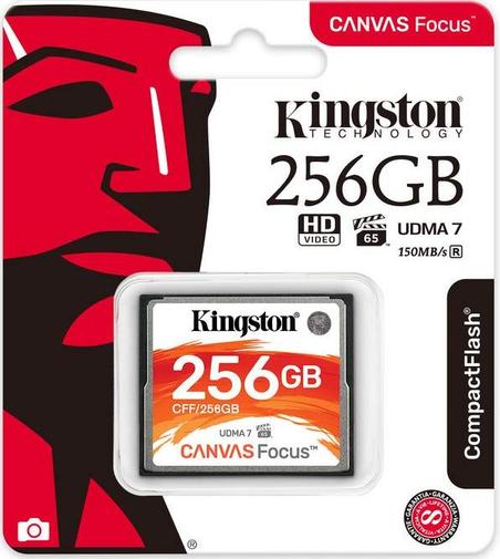Об'єм карти дорівнює 256 ГБ. Призначена для застосування із дзеркальними фотоапаратами, які підтримують Compact Flash карти пам'яті. Canvas Focus буде забезпечувати цілісність відзнятого матеріалу та надасть вдосталь місця для знімків і відео. Карта пам'яті відповідає високим стандартам якості Kingston, тому є надійною у роботі. Швидкість запису складає 130 Мб на секунду, а зчитування 150 Мб на секунду.