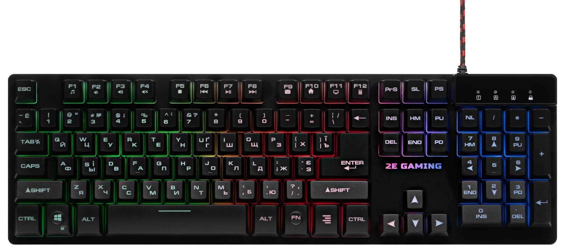 2E KG280 — ігрова повнорозмірна клавіатура із LED-підсвіткою. Металевий корпус клавіатури подарує виробу надійність та чудову зносостійкість. 104 клавіші із чітким та точним відгуком, подарують власнику перевагу над суперником в ігрових сесіях та виконанні повсякденних завдань.