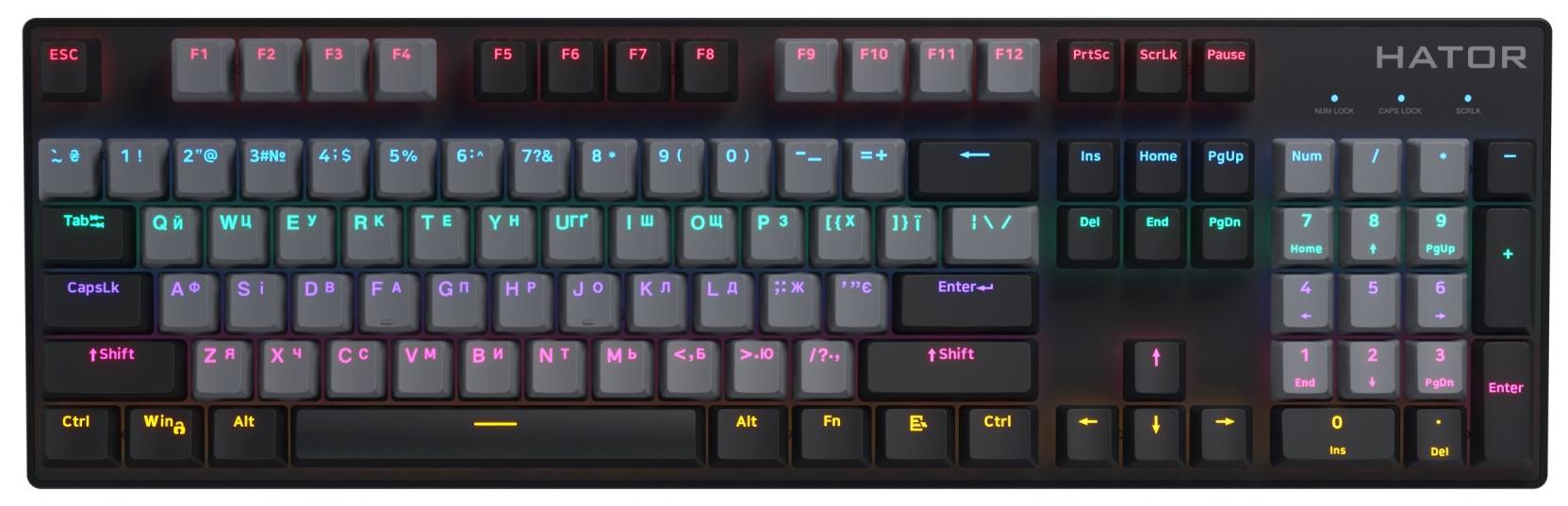 Оновлена клавіатура HATOR Starfall Rainbow отримала кейкапи з повноцінним підсвічуванням українських літер та нові перемикачі HATOR Aurum Red/Blue. Найкраще співвідношення вартості та споживчих властивостей годі й шукати. Власні механічні перемикачі HATOR Aurum змащені на етапі виробництва, що забезпечує максимальний тактильний і акустичний комфорт.